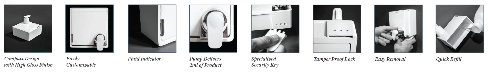 The Mosaic dispenser features a minimal design that can be customized for any amenity brand or property. The mosaic dispenser has a tamper-proof lock mechanism, but is easy to clean, refill and install. Mosaic enables your property and produce to lead the revolution of sustainable luxury.